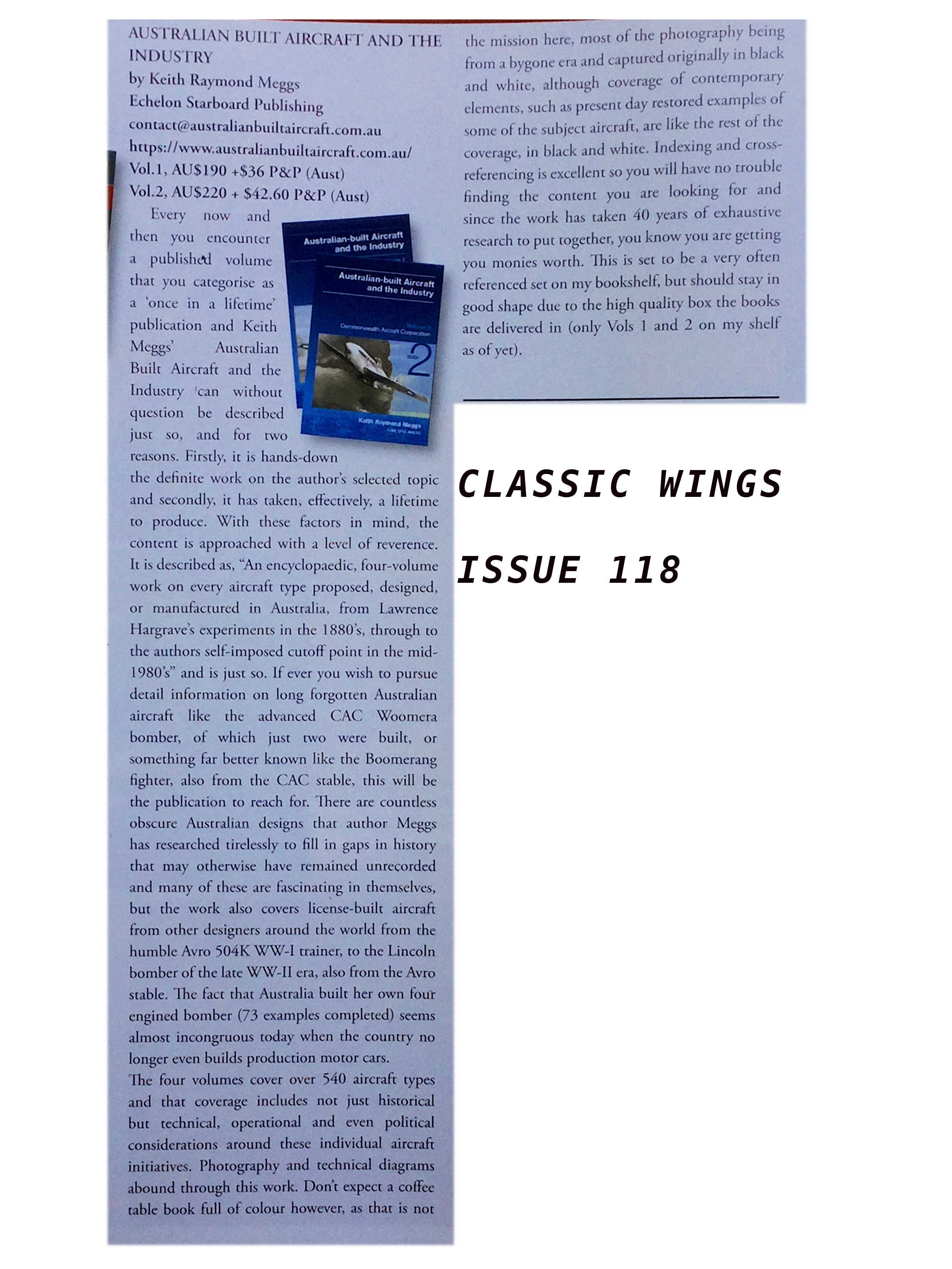 An encyclopaedic, four volume work on every aircraft type proposed, designed, or manufactured in Australia from 1884 to the mid-1980's