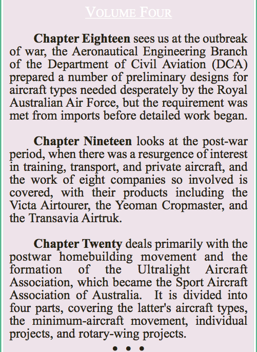 An encyclopaedic, four volume work on every aircraft type proposed, designed, or manufactured in Australia from 1884 to the mid-1980's